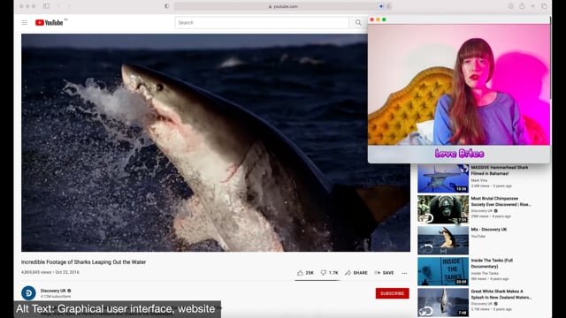Still from Video recorded through screen record with the app QuickTime on a computer, self portrait with shark teeth veneer prosthetics, YouTube video, added subtitles and AI generated alt text.